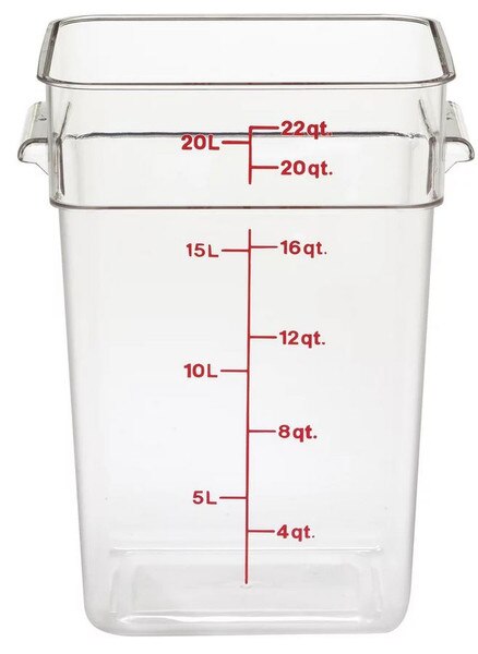 Pinit CAMB 22SFSCW-135 Clear 22 Qt Square Storage Container(0)No Reviews yet SKU: CAMB-22SFSCW135 Clear 22 qt Square Storage Container UPC CODE: 099511314898 ITEM WEIGHT: 4.2 Sale Unit : EachesDescription: CamSquare® Food Container, 22 quart., 11-1/4"L x 12-1/4"W x 15-3/4"H, with handles, red graduation, polycarbonate, dishwasher safe, resists stains & odors, clear, NSF, 6/case $34.99 Quantity discounts available QuantityPrice Out of Stock This item is currently out of stock Get Notified When Available Get Notified When Available Name Last name Email Address (required)Suscribe to marketing emails. Get notified Quantity -+ Add to Shopping Cart Details CamSquare® Food Container, 22 quart., 11-1/4"L x 12-1/4"W x 15-3/4"H, with handles, red graduation, polycarbonate, dishwasher safe, resists stains & o... Details Back DetailsCamSquare® Food Container, 22 quart., 11-1/4"L x 12-1/4"W x 15-3/4"H, with handles, red graduation, polycarbonate, dishwasher safe, resists stains & odors, clear, NSF, 6/case Reviews 0 Back Ratings & ReviewsNo reviews availableBe the first to Write a Review