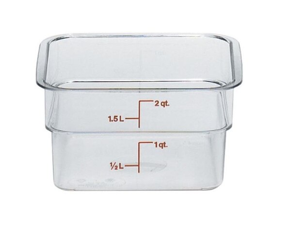 Pinit CAMB 2SFSCW-135 Clear 2 Qt Square Container(0)No Reviews yet SKU: CAMB-2SFSCW135 Clear 2 qt Square Storage Container UPC CODE: 099511314171 ITEM WEIGHT: 0.557 Sale Unit : EachesDescription: CamSquare® Food Container, 2 quart., 7-1/4"L x 7-1/4"W x 3-7/8"H, red graduation, polycarbonate, dishwasher safe, resists stains & odors, clear, NSF, 6/case $5.99 Quantity discounts available QuantityPrice This item is IN STOCKCurrent Stock: 18 Quantity -+ Add to Shopping Cart Details CamSquare® Food Container, 2 quart., 7-1/4"L x 7-1/4"W x 3-7/8"H, red graduation, polycarbonate, dishwasher safe, resists stains & odors, clear, NSF, ... Details Back DetailsCamSquare® Food Container, 2 quart., 7-1/4"L x 7-1/4"W x 3-7/8"H, red graduation, polycarbonate, dishwasher safe, resists stains & odors, clear, NSF, 6/case Reviews 0 Back Ratings & ReviewsNo reviews availableBe the first to Write a Review