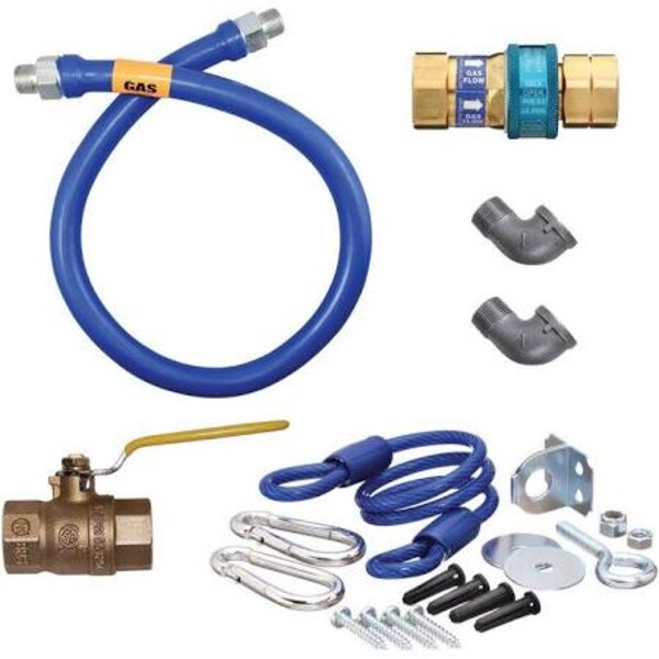 Dormont Blue Hose™ Moveable Gas Connector Kit, 3/4" inside dia., 36" long, covered with stainless steel braid, coated with blue antimicrobial PVC, 1 SnapFast® QD, 1 full port valve (2) 90° elbows, coiled restraining cable with hardware, 218,000 BTU/hr minimum flow capacity, limited lifetime warranty