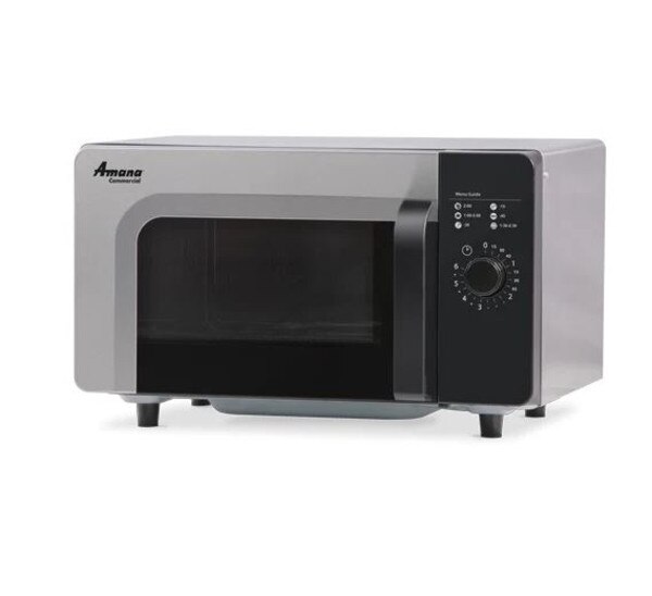 Amana® Commercial Microwave Oven, 0.8 cu. ft. capacity, 1000 watts, low volume, single stage cooking, (1) power level, lighted control dial, 6-minute max cooking time, interlock safety switch, audible end of cycle signal, side hinged door with tempered glass, LED lighted interior, stainless steel interior & exterior, 120v/60/1-ph, 13.0 amps, 15 MCA, 1500 watts (total), cord, NEMA 5-15P, cETLus, ETL-Sanitation
